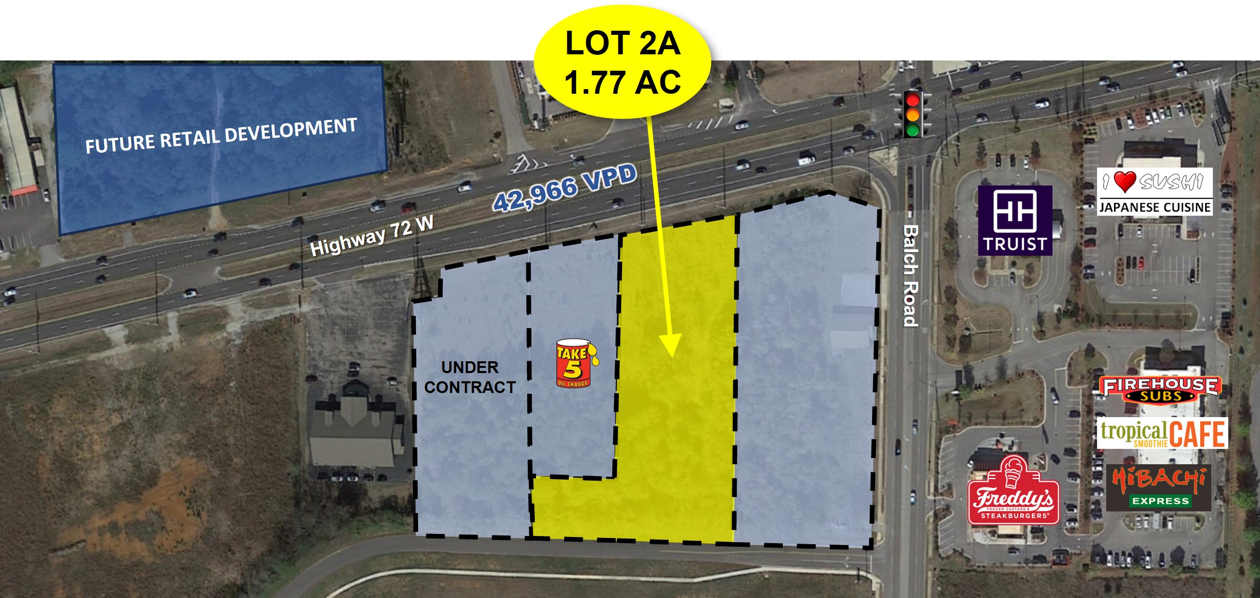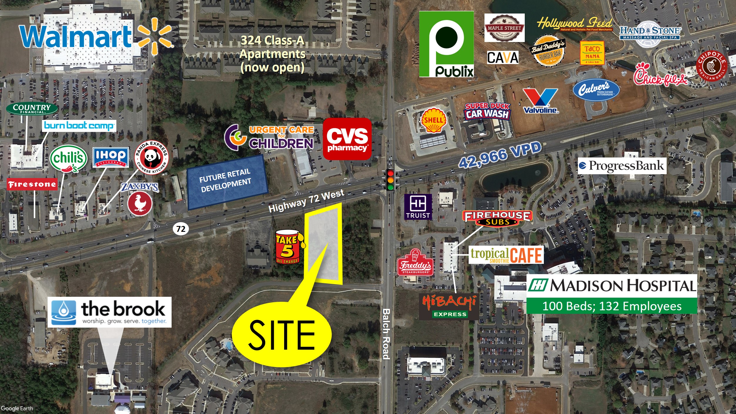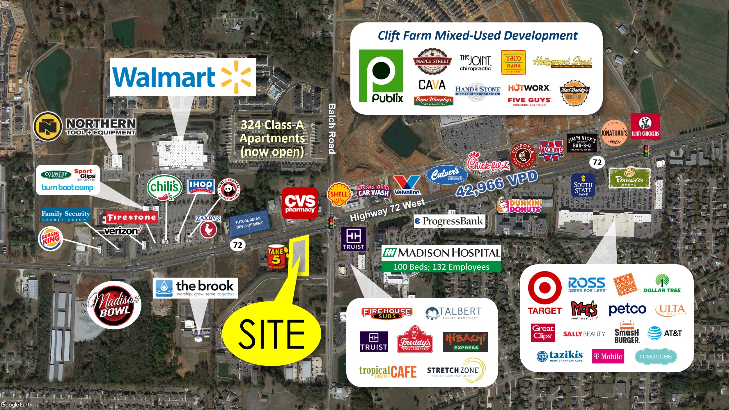 GROUND LEASE OR BUILD TO SUIT: Retail/Medical Pad Sites located at the intersection of Highway 72 West and Balch Road in Madison, Alabama. With an Average Household Income of $128,587, Huntsville is now the largest city in the state and in 2022 was ranked the No.1 “Best Place to Live” by U.S. News & World Report. This property receives incredible exposure with Traffic Counts of 53,112 VPD at the intersection of Balch Road. Across the street is the new Clift Farm Mixed-Use Project, the 550-acre development consisting of 1,750 residential units, 350,000 SF of office, and 400,000 SF of retail. On the other side of Balch Rd is Madison Hospital, a 100-bed facility that is part of the Huntsville Hospital System.