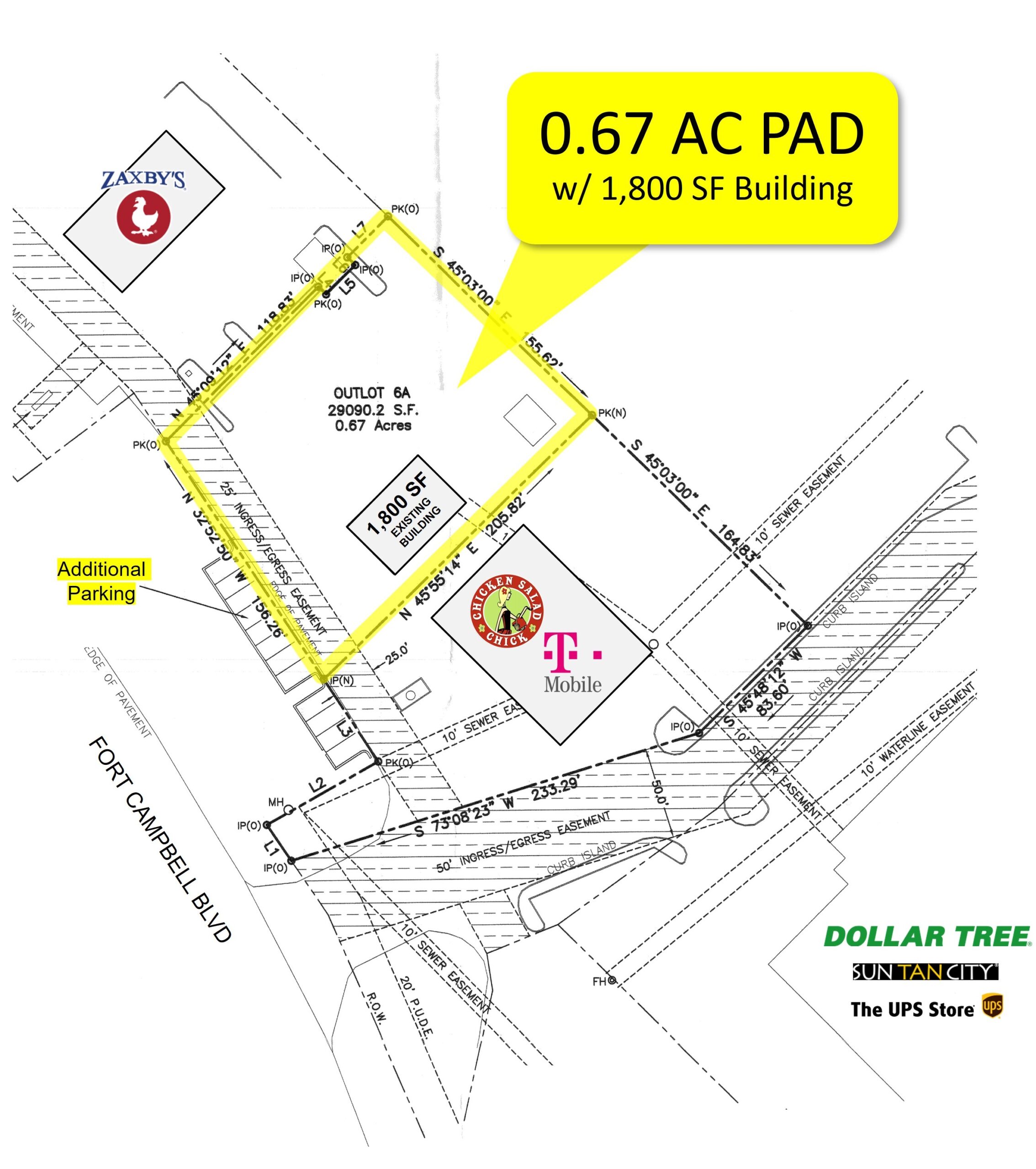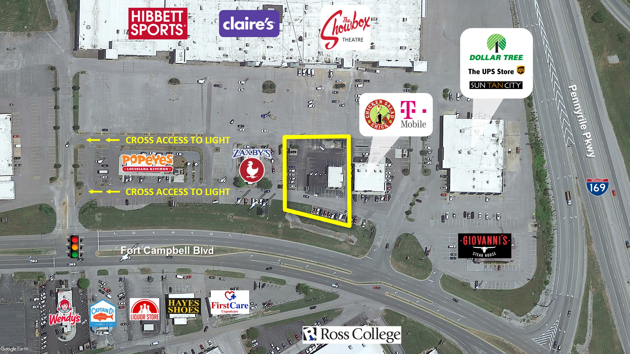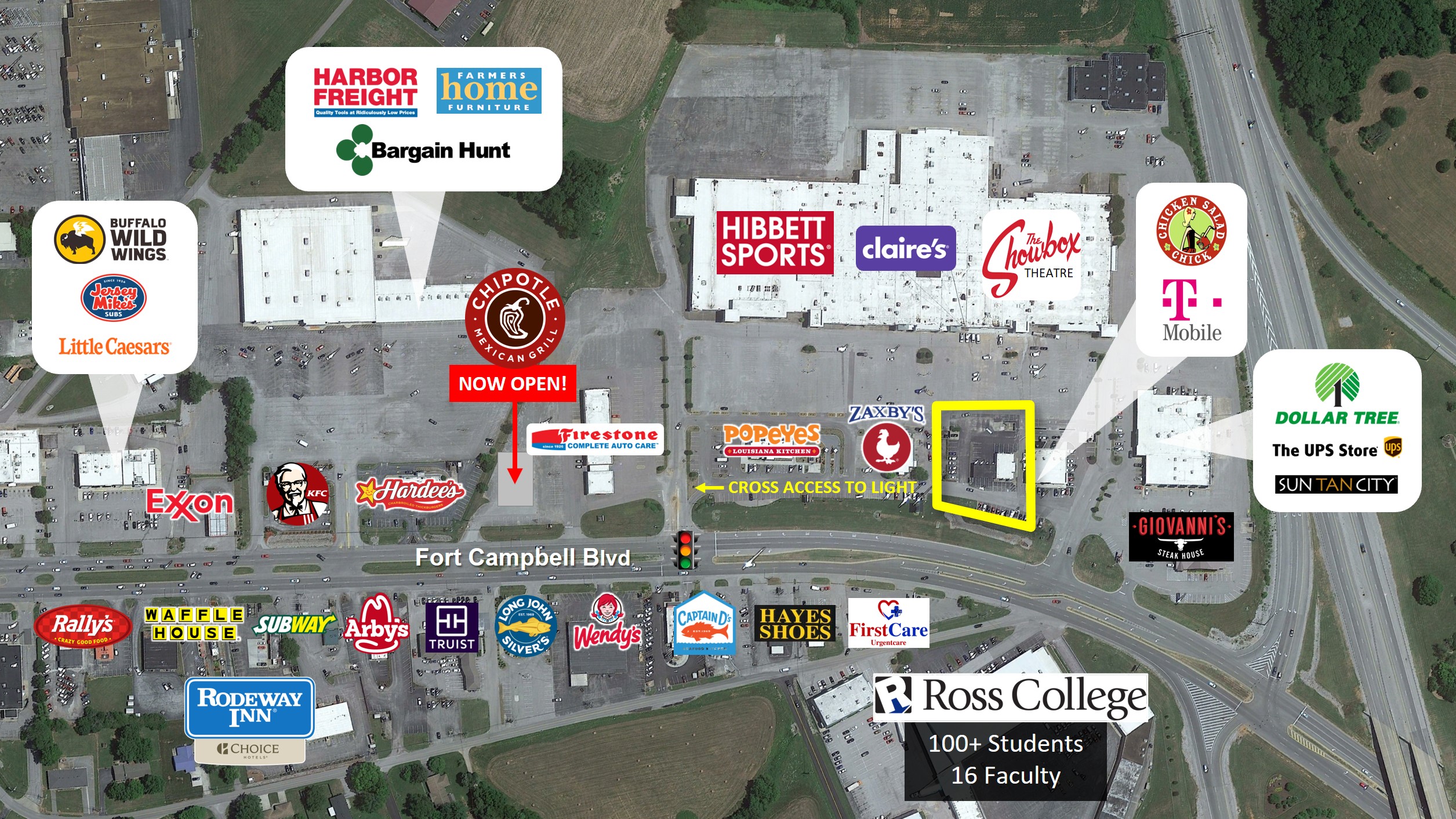 GL OR BTS: 0.67 AC Pad Site with existing 1,800 SF Building at Fort Campbell Blvd and Pennyrile Pkwy in Hopkinsville, KY. This trade area is the main shopping and dining destination for Fort Campbell Army Base, consisting of over 197,000 Employees and Civilians. Property has Cross-Access through Zaxby’s and Popeyes back to the Traffic Light on Fort Campbell Blvd. Fantastic visibility with combined Traffic Counts of 44,554 VPD at Fort Campbell Blvd and I-169/Pennyrile Pkwy. Consistent flow of daytime business with 17,496 Employees within 3 miles and 20,359 Employees within 5 miles.